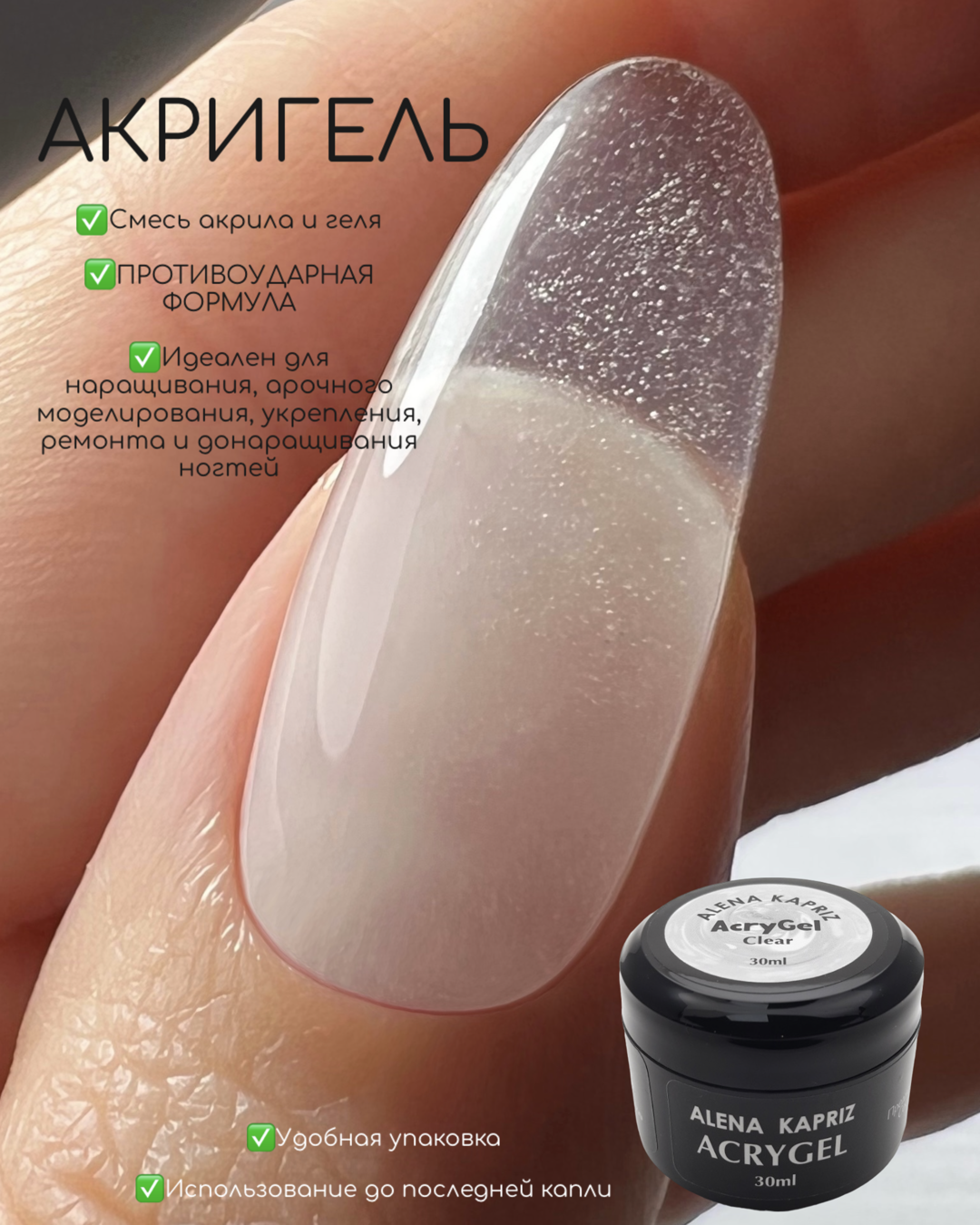 AcryGel-объединил в себе лучшие характеристики акрила и геля.Благодаря своей густой консистенции, материал удобно смоделировать и распределить по ногтевой пластине.