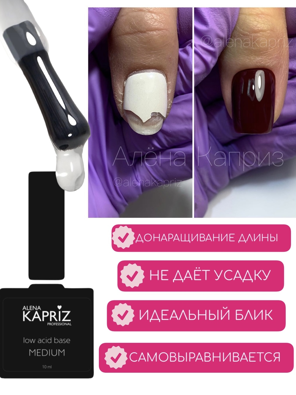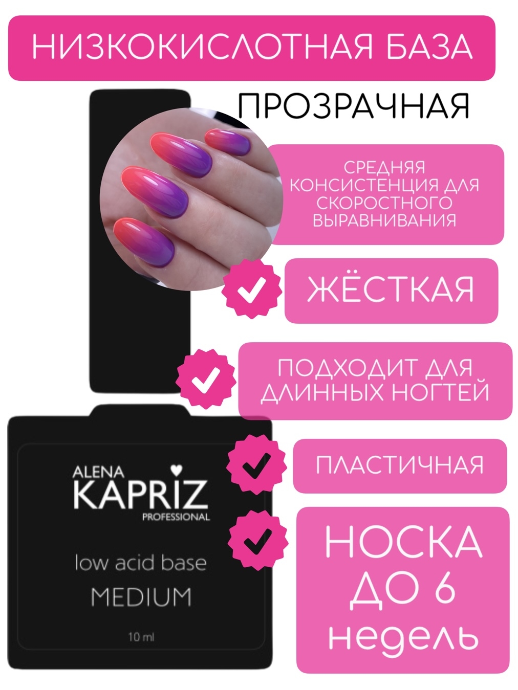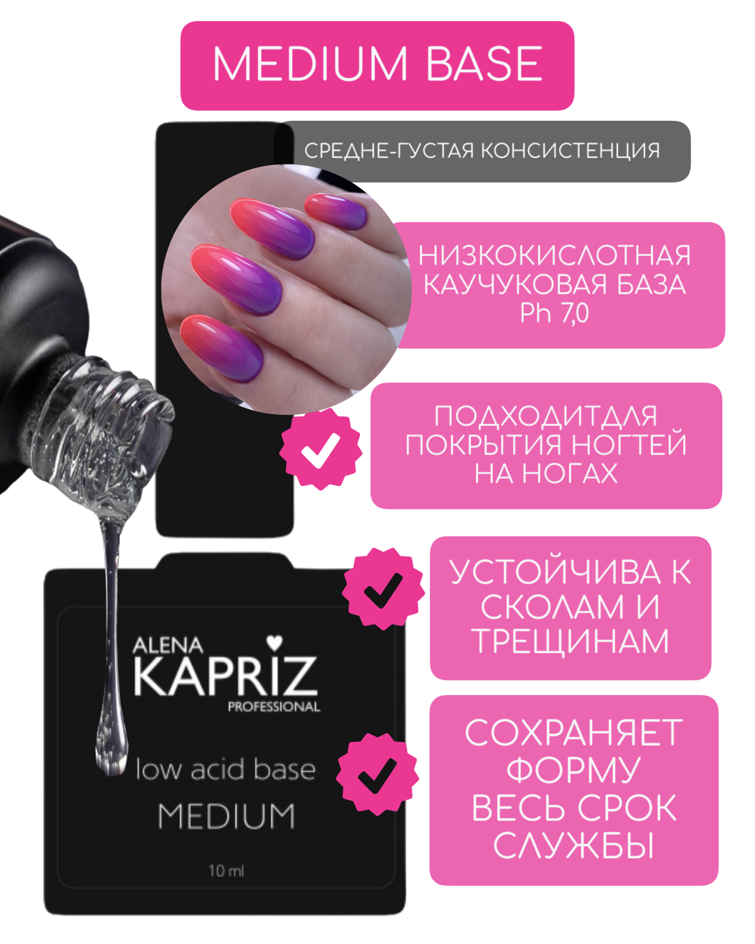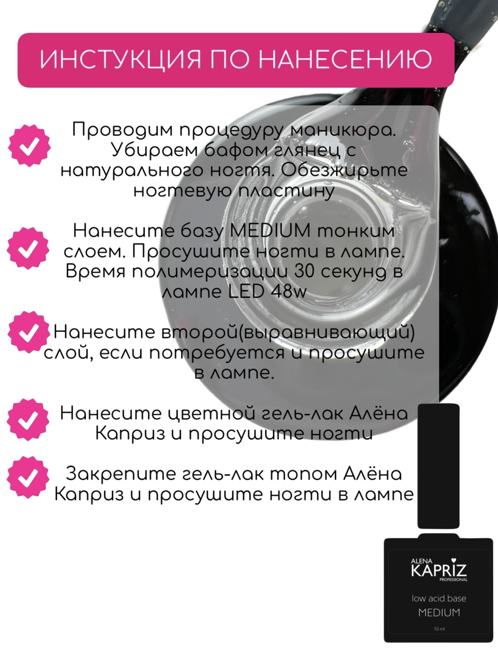 Представляем Вам низкокислотную базу MEDIUM (средняя консистенция) ТМ Алена Каприз. База создана для использования в качестве маскирующего неровности цвета ногтя покрытия , а также ,как основа под маникюр с френч дизайном. Каучуковая база имеет среднюю консистенцию medium. Преимущества базы: Не требует использования праймера и нанесения любой другой основы, Удобство нанесения по ногтю, легко укладывается в красивую форму, Экономно расходуется, Идеально выравнивает мелкие и средние неровности ногтевой пластины, Пластичность после полимеризации, Совместимость со всеми материалами (биогель, гель-лак, уф-гель),Подходит для любого типа ногтей, Легкое удаление при помощи специальной жидкости и спиливании, Идеально подходит для покрытия ногтей на ногах, Устойчива к сколам и трещинам. Время полимеризации в UV 36W-3 мин; в LED 48W-1,5 мин.