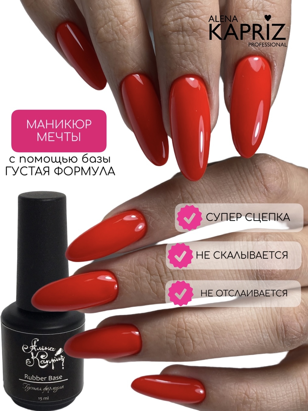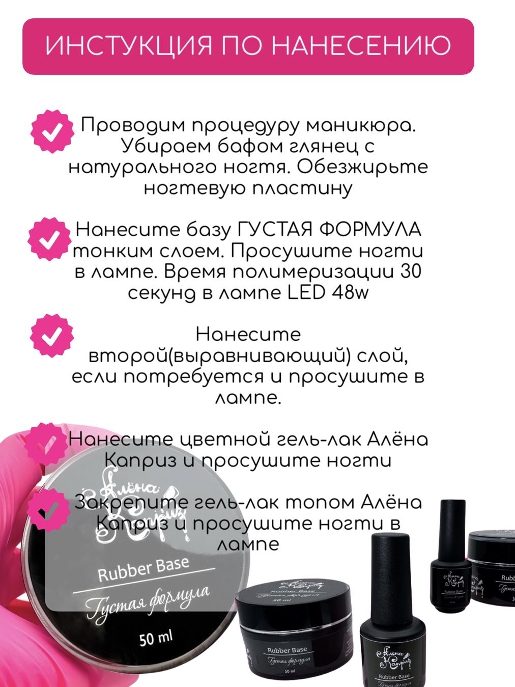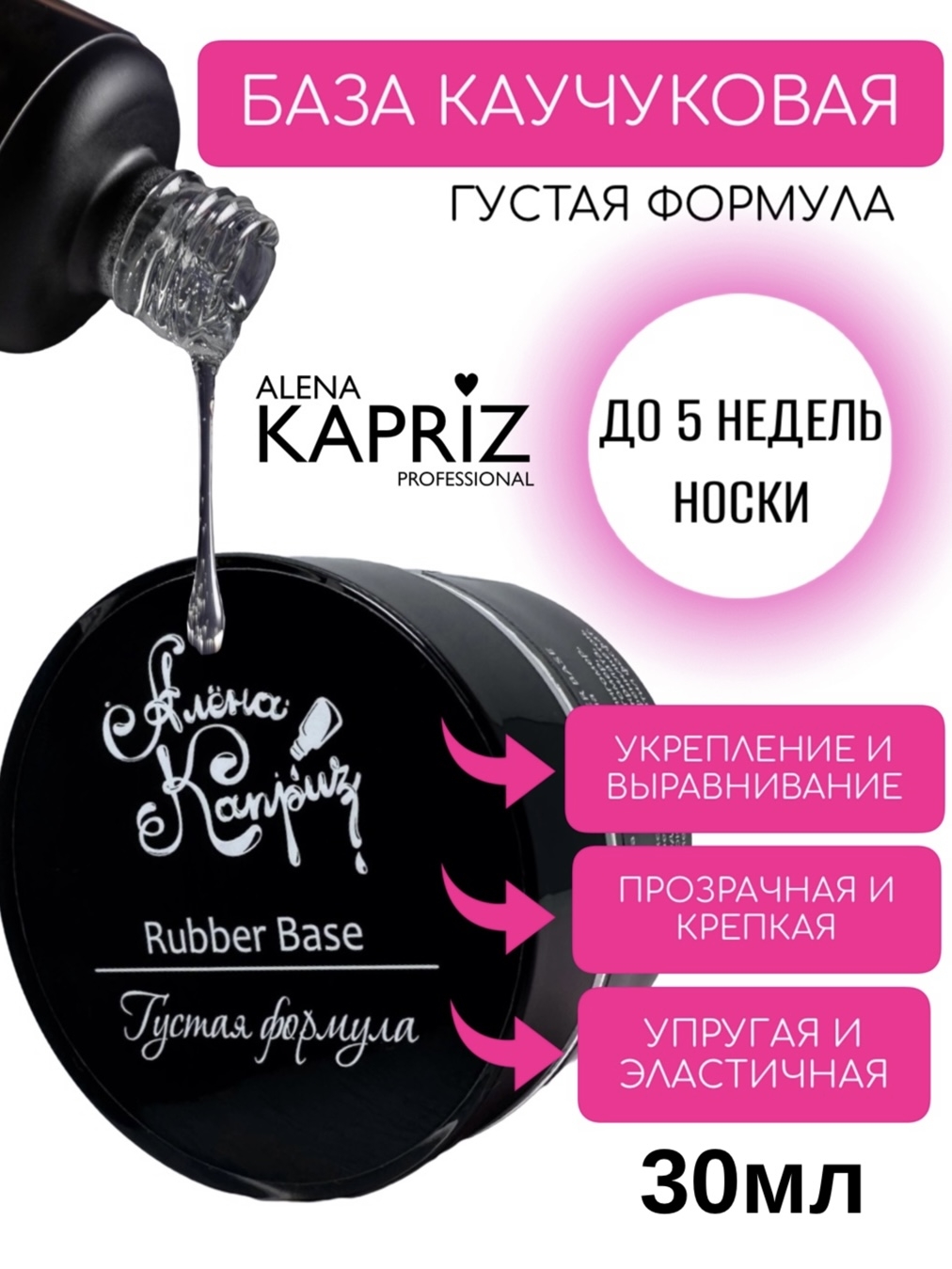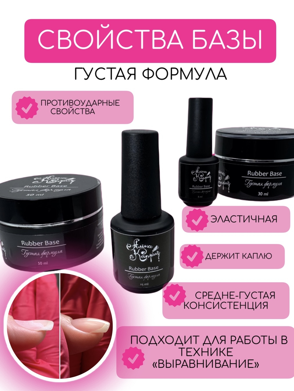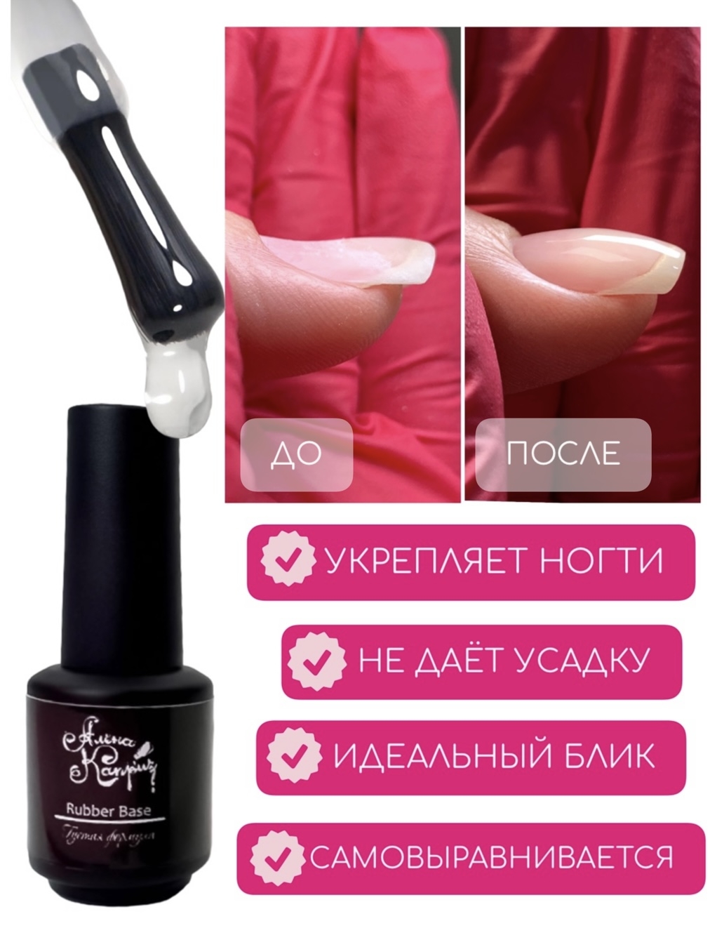 Rubber base-базовое покрытие для гель-лака, защищает ногтевую пластину от сколов и трещин, уменьшает влияние физического и химического воздействия окружающей среды ( бытовая химия,контакт с водой и тд.). Поэтому, каучуковая база особенно актуальна для проблемных и тонких ногтей, склонных к расслоению и ломкости. База способна скрывать все неровности ногтя, работая в технике "выравнивание".