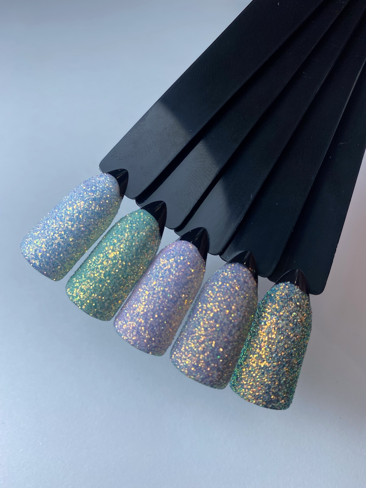 2.Посыпать-на просушенное цветное покрытие наносится тонкий слой каучуковой базы,на не просушенную поверхность методом посыпания обильно наносим Shine,сушим в лампе.Топом закреплять не нужно.