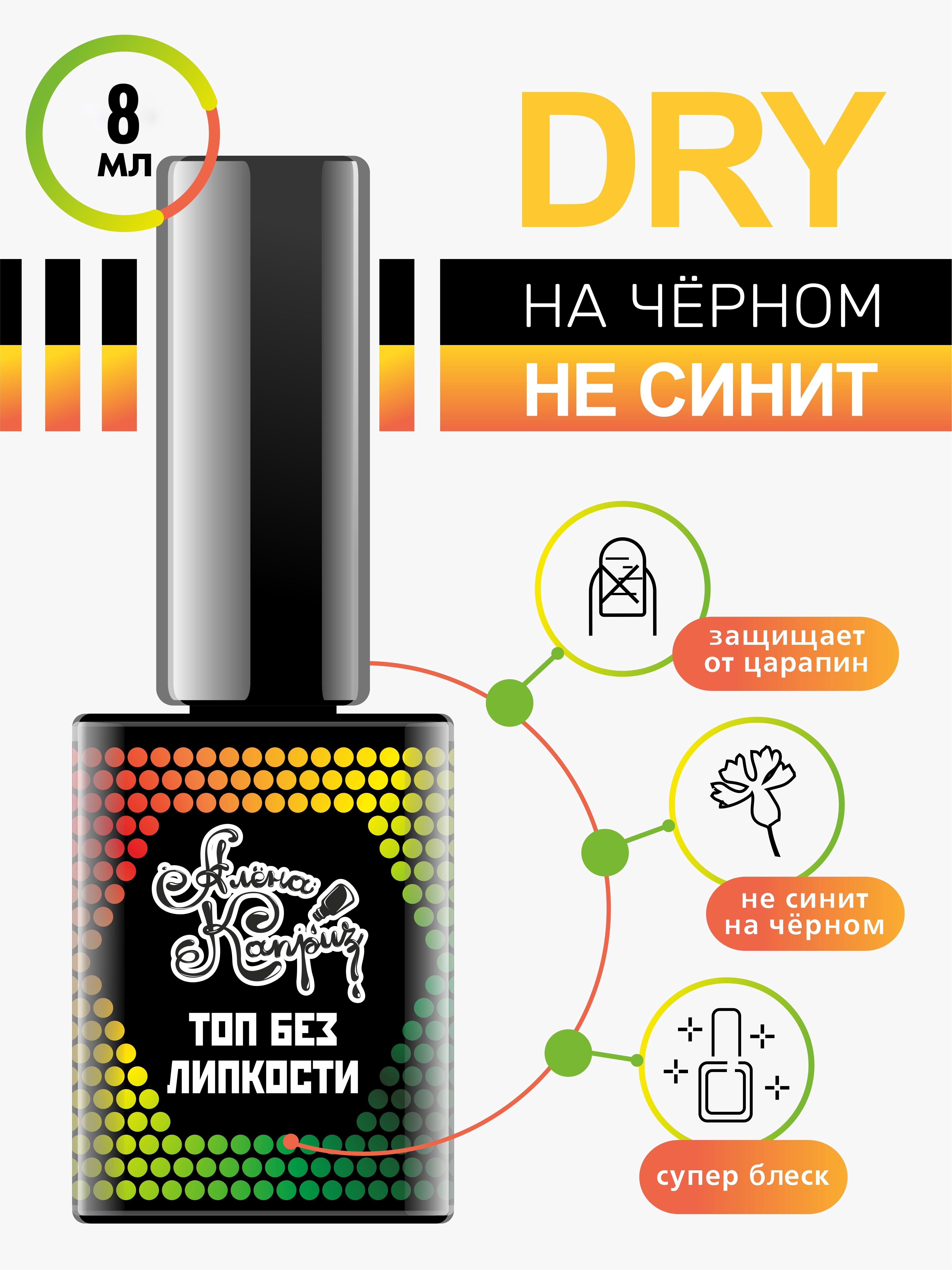Представляем Вам универсальный глянцевый топ без липкого слоя DRY TOP. Жидкой консистенции ,идеально подходит для всех оттенков гель лака,не синит на черном и не желтит на белом, защищает покрытие от царапин, не трескается, не скалывается,не затирается. Способ применения:топ наносится на ноготь как завершающая стадия покрытия,после нанесения базы и цвета ,покрытие тщательно просушивается и наносится топ . Время полимеризации в UV-36W-2мин, в LED 48W-1 мин