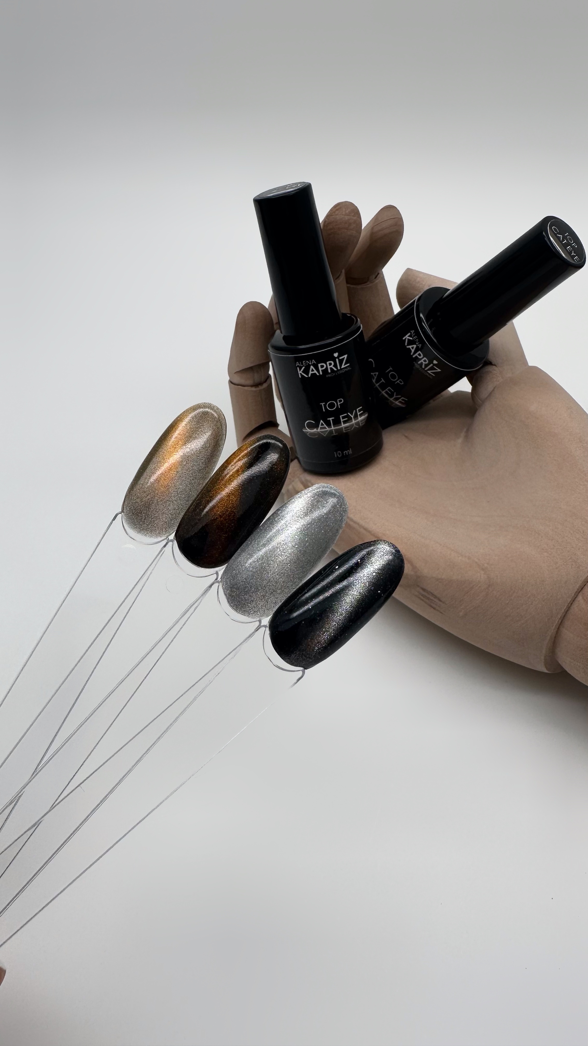 Для достижения эффекта "кошки" на ногтях ,необходимо поднести магнит к непросушенному слою топа-завершающему этапу маникюра на расстоянии 0.5 см от поверхности ногтевой пластины. Достигнув эффекта, просушить. Такой гель лак топ идеально подойдет для создания праздничного образа, новый год, день рождения и просто на каждый день.