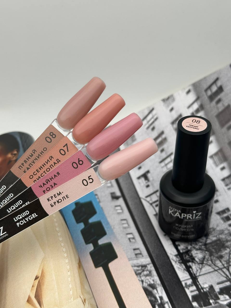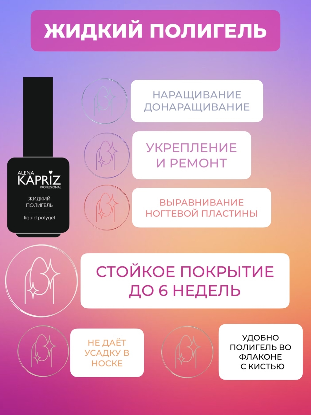 Жидкий полигель Алена Каприз – это твердось акрила и пластичность геля в одном флаконе. С помощью жидкого полигеля Вы можете нарастить длину ногтей, укрепить их и отремонтировать сломанный свободный край. Выбирая данное средство, Вы обеспечите себе длительную носку маникюра до 6 недель. Подходит для всех видов удлинения ногтей: наращивание на верхних и нижних формах, для типс. Профессиональное средство можно использовать на любых ногтях. Твердый гель дает маникюру еще большую прочность и долгую носку. За счет консистенции материал удобно наносить и распределять. С его помощью можно делать донаращивание и ремонт ногтей. Это продукт, который вобрал в себя лучшие свойства полигеля и консистенцию базы. Прозрачная основа под гель-лак суперпрочная, универсальная и износостойкая. Полигель для гель лака защитит Ваши ногти от ломкости и расслаивания, решит проблему сколов и отслоек. Самовыравнивается, поможет скрыть любые дефекты на поверхности ногтевой пластины. Не проседает, не печет в лампе и не имеет запаха. Средство для маникюра держит арку, укрепляет хрупкие и ломкие ногти любой сложности. Жидкий полигель не требует дополнительных навыков моделирования. Он сам подстраивается к технике работы мастера из-за своей пластичности. Практически не требует опила, тем самым ускоряя процесс формирования архитектуры. Прозрачный полигель для ногтей имеет густую, вязкую, самовыравнивающуюся консистенцию, которая позволяет выстроить идеальную архитектуру ногтя. Средство не печет при полимеризации и обладает безопасной формулой покрытия, что делает его гипоаллергенным. Профессиональное средство подходит как для домашнего, так и для салонного использования nail- мастерам. Необходимо нанесение подложки из эластичной базы. Жидкий полигель для гель лака хорошо опиливается при коррекции формы после полимеризации. Сохнет в любых лампах для маникюра (УФ и LED, а также в гибридных лампах, не печет, не отслаивается от покрытия, прочно держит любой шеллак, маникюр и педикюр. Перед применением рекомендуем использовать ремувер, бондер, праймер и дегидратор. Отлично сочетается с гель лаком, топом, дизайном для ногтей. Жидкий полигель – это лучший выбор для Супер сцепки с любым покрытием!