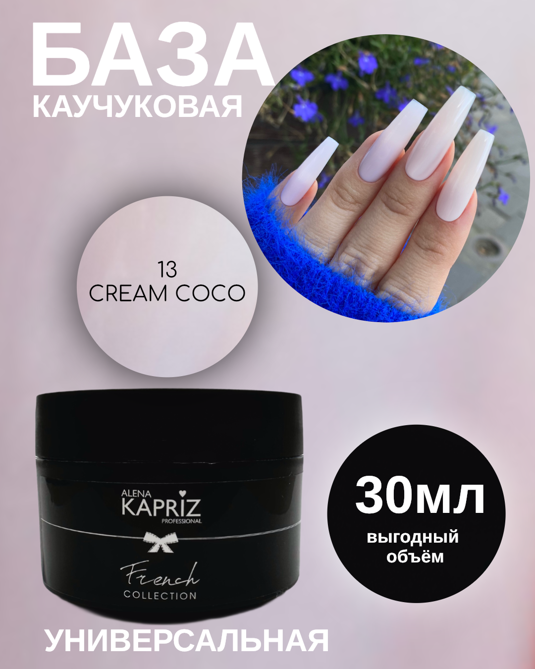 Камуфлирующая база Алёна Каприз- создана для использования в качестве маскирующего неровности цвета ногтя покрытия , а также ,как основа под маникюр с френч дизайном.