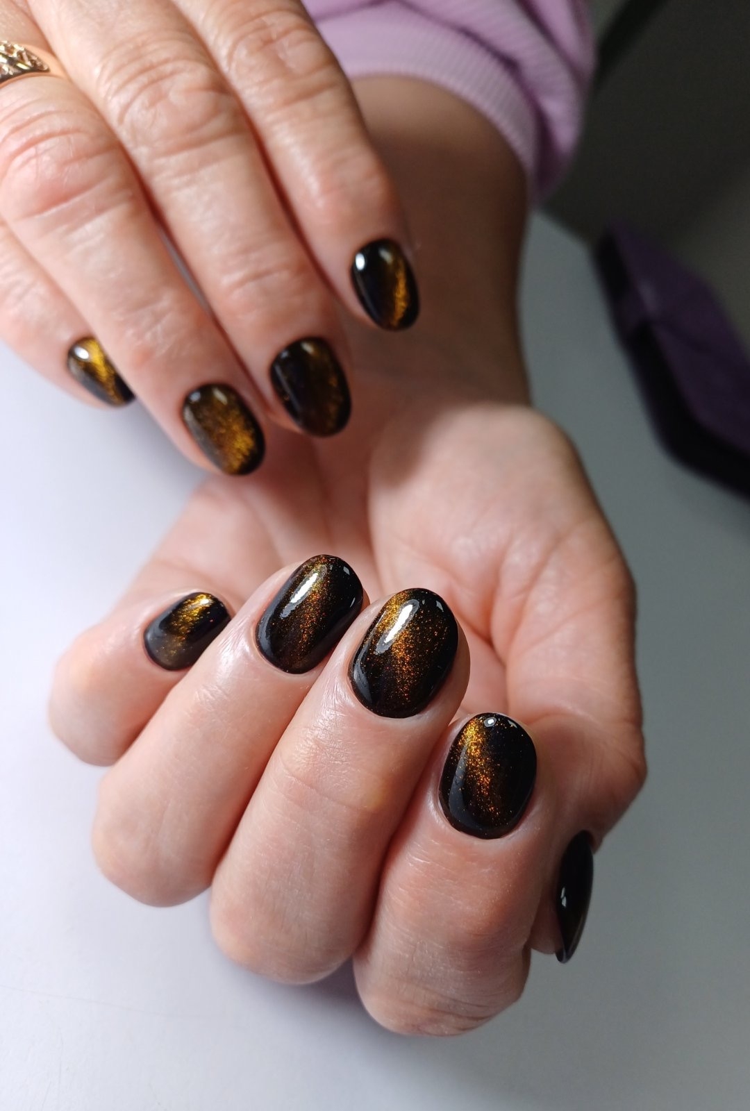 Для достижения эффекта "кошки" на ногтях ,необходимо поднести магнит к непросушенному слою топа-завершающему этапу маникюра на расстоянии 0.5 см от поверхности ногтевой пластины. Достигнув эффекта, просушить. Такой гель лак топ идеально подойдет для создания праздничного образа, новый год, день рождения и просто на каждый день.