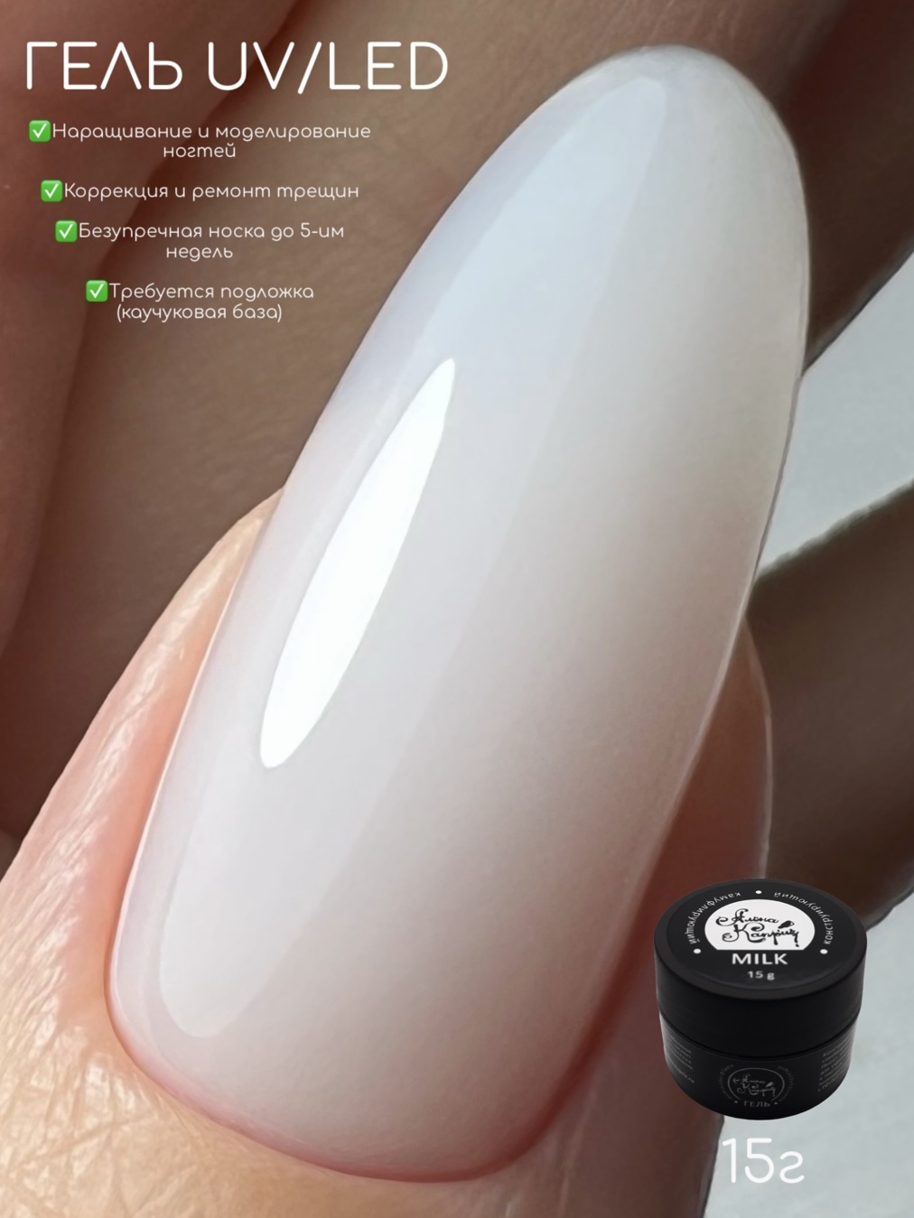 Конструирующий, молочный гель средней вязкости с липким слоем. Позволяет удлинить ногтевое ложе и выполнить нанесение стык в стык с белым френчем. Подходит для укрепления натуральных ногтей. Благодаря средней вязкости, облегчает моделирование, сохраняя заданную форму. Обладает свойством самовыравнивания. Не растекается в жару. Эластичность и ударостойкость создают возможность амортизации, благодаря чему трещины, сколы и отслойки вас не побеспокоят. Гель растворимый.
